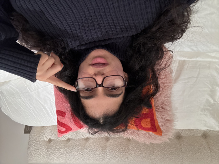 A woman with dark, wavy hair and glasses lies on a bed. She wears a dark blue sweater and points to her glasses with her left hand. Her head rests on a pink and orange pillow with a large letter printed on it. The bed has white sheets and a textured, light-colored headboard with button details. The room is brightly lit.