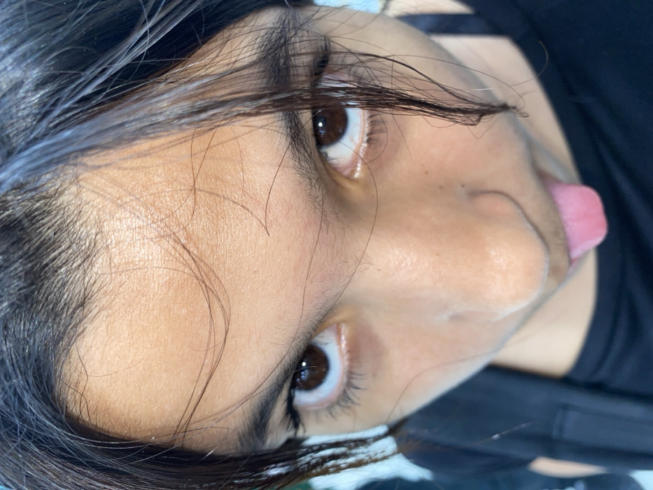 close-up of a person's face, tilted sideways. The person has brown eyes and dark hair that falls across their forehead. Their skin tone is warm and there are a few stray hairs on their face. The tip of their pink tongue is visible sticking out from their mouth. The person is wearing a black top. The image has good lighting and focus.