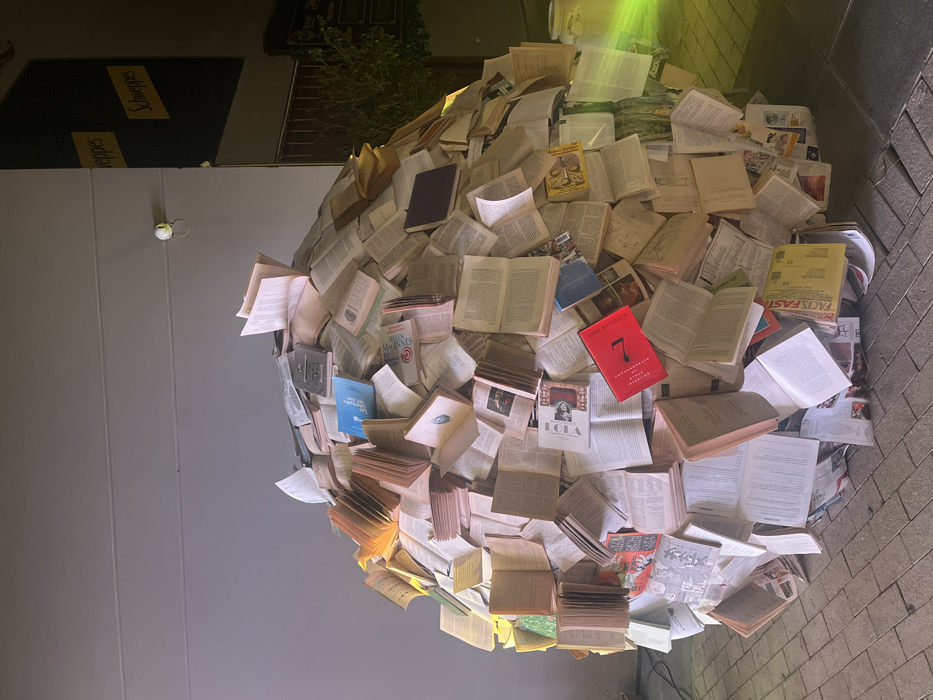 A spherical sculpture or installation made of numerous books and open pages dominates the scene. The books vary in size and color, including a red book with a large number "7" on the cover and a book titled "LOLA". The structure is illuminated by a beam of yellow light from above. A gray wall and brick pavement are visible in the background. A sign bearing the word "Schweppes" can be seen on the wall.