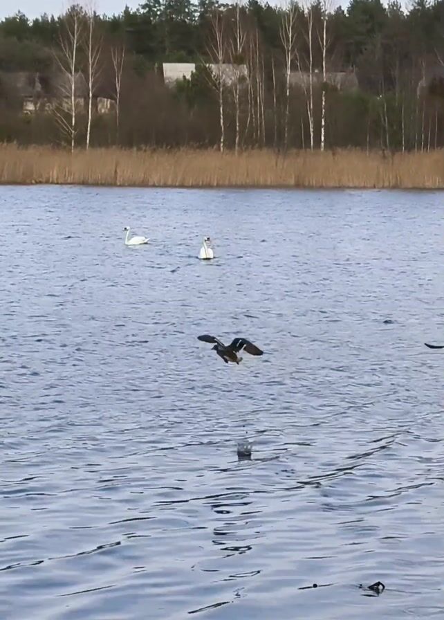 lake with two swans swimming in the distance and three ducks flying over the water