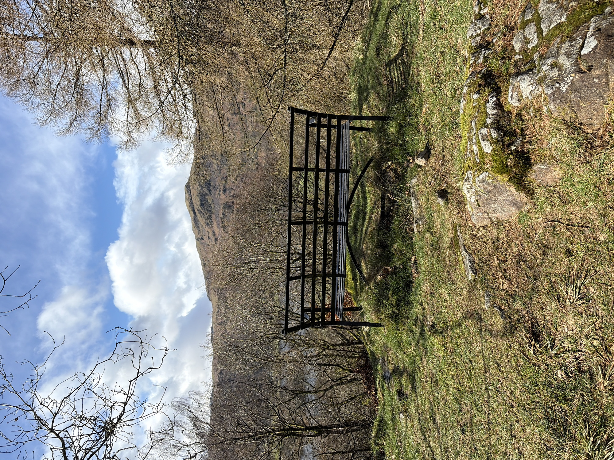 This image depicts a scenic overlook within the Grasmere area, United Kingdom, presenting a vista over a body of water and distant fells. A dark-colored, possibly black metal, park bench with horizontal slats for the seat and backrest is positioned centrally in the midground. The bench faces away from the camera, oriented towards the panoramic view. The ground in the foreground is covered in green grass interspersed with patches of dry brown foliage and several exposed rocks, some of which are covered in green moss. Beyond the bench, the terrain slopes downwards, revealing a section of a body of water, likely Grasmere Lake, visible through a dense collection of bare deciduous trees. Further in the background, a large, treeless mountain or fell dominates the horizon. The sky is bright blue with scattered white cumulus clouds. A large conifer tree with light brown needles is visible on the right side of the frame. The scene is devoid of human presence or activity, indicative of a natural landscape in late winter or early spring, characterized by the largely defoliated trees.