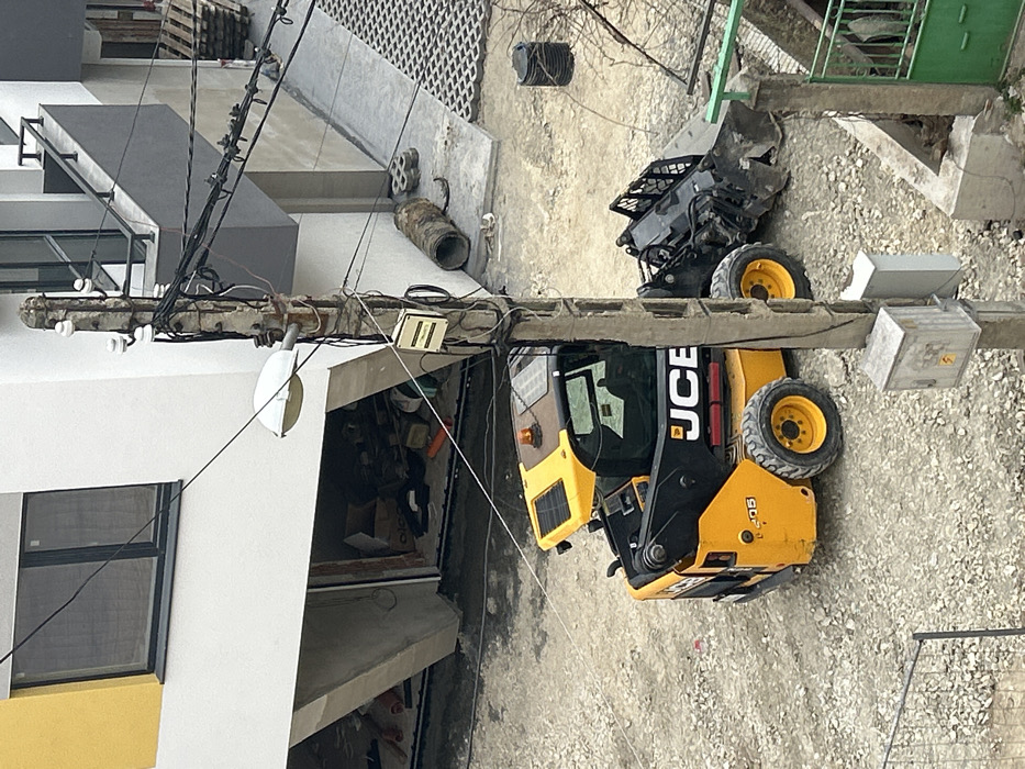 This image depicts an outdoor construction or renovation scene in Shumen, Bulgaria, under an overcast sky. A yellow and black JCB 205 skid steer loader is centrally positioned on a gravel and dirt surface. The loader's engine compartment appears raised or open, and a solar panel is affixed to its cabin roof. To the right of the loader stands a concrete utility pole, heavily burdened with numerous black electrical wires, multiple ceramic insulators, and several attached utility boxes. A white street lamp fixture extends horizontally from the pole to the left. In the background, a multi-story building, likely residential, exhibits a white facade with a distinctive yellow section on its upper left. The ground floor features open bays, which contain various construction materials, cardboard boxes, pipes, and debris. Upper levels of the building display dark-framed windows and balconies equipped with black railings. An area paved with gray hexagonal interlocking concrete pavers is visible near the building on the right, adjacent to a stack of wooden pallets. Additional elements within the scene include a large, rusted metal pipe segment lying on a concrete slab near the utility pole, a black plastic barrel, bare tree branches on the right, a temporary metal fence panel in the lower left, and a green metal gate with a concrete fence post in the lower right. No individuals are present in the image.
