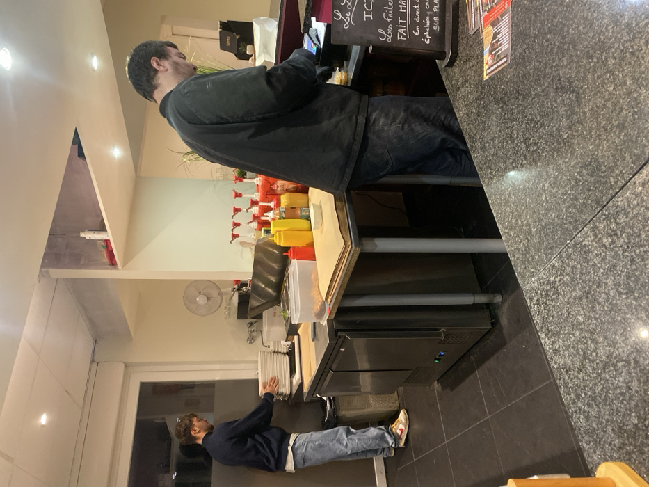 In a bright, tilted indoor setting, two people are visible. One, wearing a dark jacket and jeans, stands behind a food preparation counter, appearing to use a phone. The counter displays numerous condiment bottles. The second person, wearing a blue sweater and jeans, is near a window and a stack of paper items, possibly menus. A cooling unit and a fan are also visible behind the counter. The setting appears to be a restaurant or fast-food establishment.