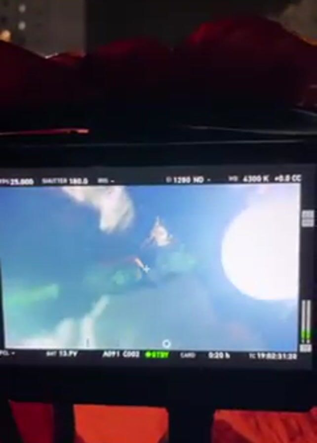 screen displaying camera footage. The screen's readout indicates settings such as FPS 25.000, SHUTTER 180.0, and WB 4300 K. The video feed on the screen depicts a person with long, wavy brown hair surrounded by several individuals. They are standing in an outdoor environment at night, with buildings visible in the background. A bright light source is prominent in the scene. The camera's view is partially obstructed by red fabric in the foreground.