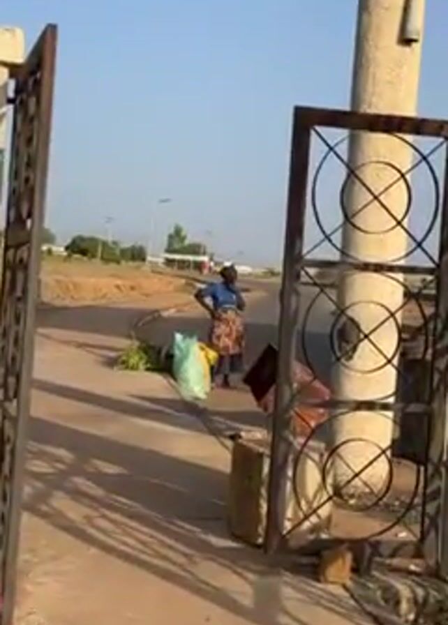 From behind a metal gate, the camera shows a person in a blue shirt, brown patterned skirt, and black head covering standing near a road