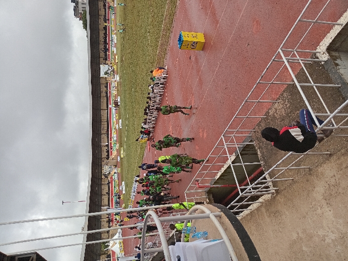 The image presents an elevated view of Kinoru Stadium in Meru, Kenya, under an overcast sky