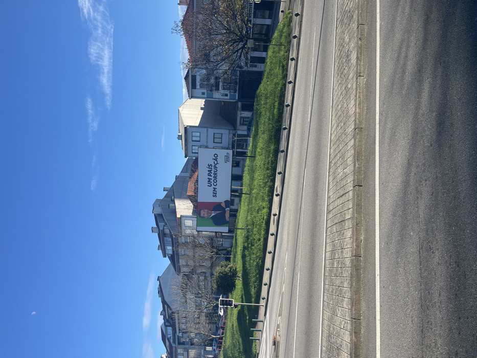 The image displays an urban street scene in Porto, Portugal, under bright daylight with a clear blue sky and a visible crescent moon in the upper left. In the foreground, a multi-lane asphalt road stretches horizontally, with a white lane marking closest to the viewer. Adjacent to the road is a light grey paved sidewalk, composed of rectangular blocks, separated by a curb. Beyond the road and sidewalk, a grassy embankment slopes upward. A line of dark, spherical bollards is evenly spaced along the top of this incline. A large billboard stands prominently on the embankment. The billboard features a smiling male figure in a dark suit, positioned on the left against a green background. The right side of the billboard displays the text "UM PAÍS SEM CORRUPÇÃO" (A Country Without Corruption) in red capital letters on a white background, with a smaller "CHEGA!" logo visible at the bottom center. Behind the embankment and billboard, a dense row of multi-story buildings, typical of urban residential architecture, forms the background. These structures vary in height, predominantly between three and five stories, with visible windows and some balconies. Deciduous trees, largely bare, are interspersed among the buildings and along the street level. A dark traffic light pole stands on the far left of the grassy area. Several parked vehicles are partially visible behind the embankment among the buildings. No individuals are discernible in the scene.
