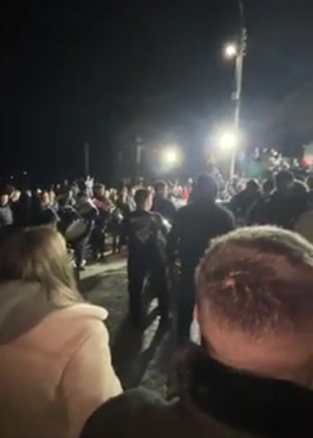 A crowd of people gathers at night, illuminated by a streetlight. Several individuals in the center appear to be playing drums, creating a rhythmic sound. The crowd is densely packed, with many wearing dark clothing. Some individuals are visible on an elevated platform in the background.