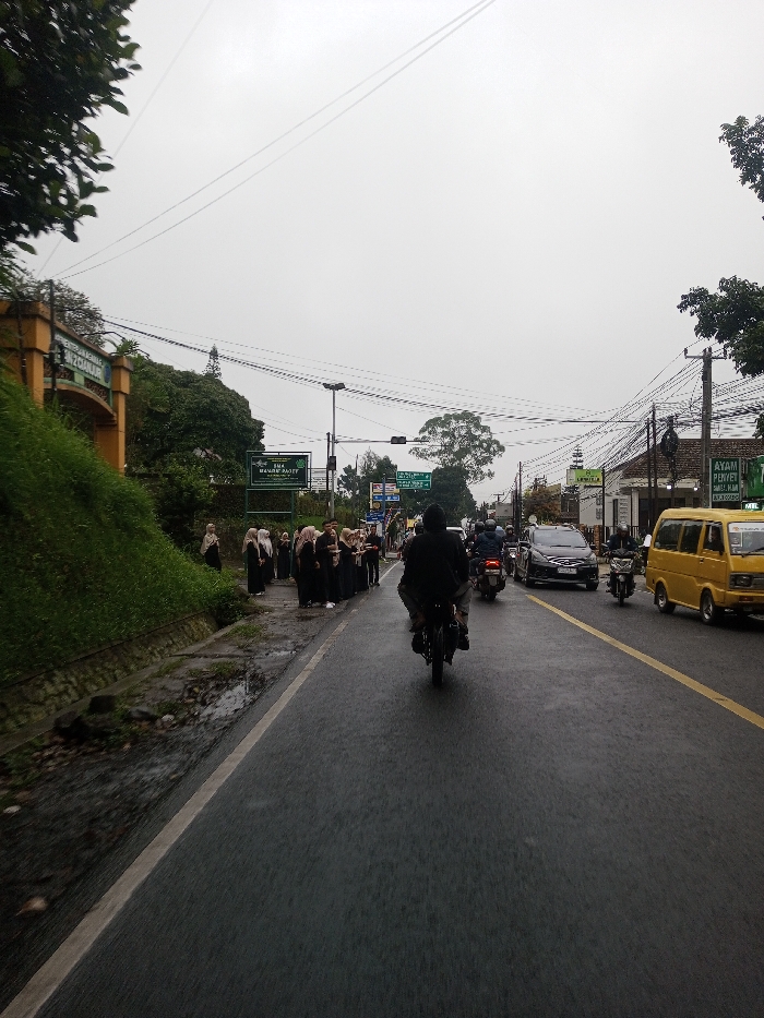 The image portrays a wet, overcast street scene in Chagzam_Pam, Bhutan. The asphalt road, marked by a solid white line on the left shoulder and a solid yellow center line, shows visible moisture from recent rain. A person on a black motorcycle, wearing a dark jacket, is in the foreground, traveling away from the camera. Multiple other motorcycles and vehicles, including a dark SUV and a yellow van, are visible in both directions, forming traffic. On the left side of the road, a group of approximately 10-15 individuals, predominantly women, stand on the concrete shoulder. They are dressed in black garments and various light-colored headscarves (hijabs). Behind them, a steep, green grassy embankment rises, partially obscuring a yellow archway structure and a prominent green sign displaying Indonesian text, "SMA MANBAUL 'ULUM" and "MENERIMA SISWA BARU." A small stream of water flows in a gutter at the base of the embankment. Utility poles support a dense network of overhead electrical wires across the frame. Buildings line the right side of the street, with a prominent yellow sign featuring black text "AYAM PENYET KANTIN" visible on one structure. The sky is uniformly light grey, indicating heavy cloud cover. Traffic lights are visible further down the road.