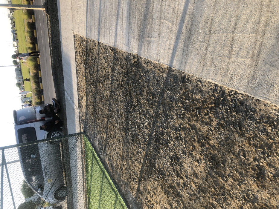 The image captures an outdoor scene in the city of النعيلة, Saudi Arabia, during daylight hours, indicated by strong directional lighting and long shadows. The immediate foreground on the left contains a green chain-link fence, behind which artificial green turf is visible. Adjacent to the fence, a patch of bare ground composed of dirt and scattered gravel extends towards a clean concrete pathway that occupies the right side of the frame. In the midground, a silver minivan is parked parallel to a paved road. Two adult males are seated on the ground next to the driver's side of the minivan. The male on the left wears dark clothing. The male on the right, also in dark attire, holds an object in his hands and has a white rectangular object on the ground beside him. The paved road features a yellow and black striped curb, bordering a landscaped median with low green shrubs. The background reveals a wide, open green field where approximately ten individuals are present, some standing and others seated, suggesting recreational activity. Several individuals on the field are dressed in traditional white thobes. Additional vehicles are visible in the far background.