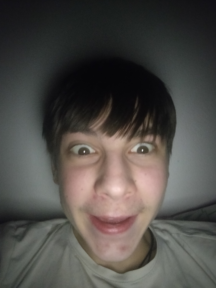 A close-up, slightly distorted selfie shows a person with dark brown hair and wide eyes staring intensely at the camera. Their mouth is slightly open in a somewhat unsettling grin. The lighting is dim, casting shadows that emphasize the facial features and create an eerie atmosphere. The person wears a light-colored T-shirt. The background appears to be a wall, further obscured by the darkness. The overall impression is one of exaggerated expression and slightly unsettling intimacy.