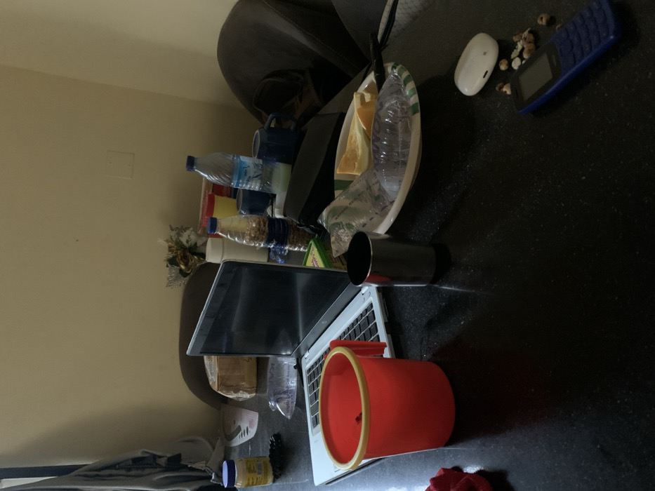 This image captures an indoor scene, specifically a cluttered table in Ado, Nigeria