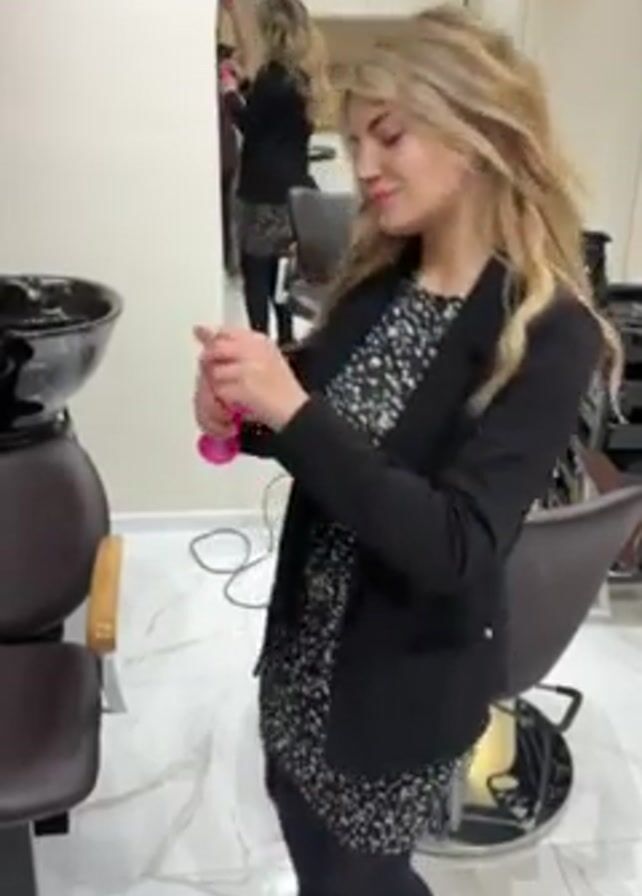 A woman with long blond hair, wearing a black blazer over a black and white floral dress and black tights, stands in what appears to be a hair salon
