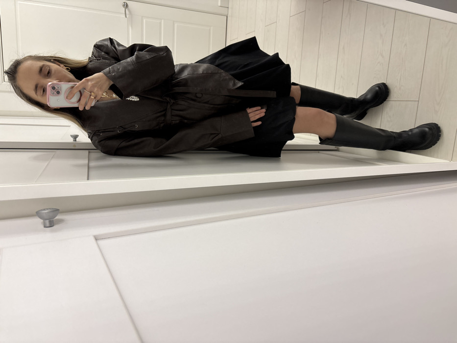 A woman lies sideways on a white surface, possibly a cabinet. She wears a brown leather coat, black dress, and black knee-high boots. She holds a cell phone, seemingly taking a selfie. Her face is visible, showing rings on her fingers and earrings. The background includes white cabinets with silver handles and light-colored wooden flooring. The entire scene is captured at an angle, tilting the subject.
