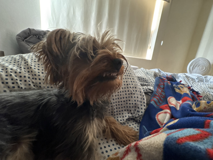 A small dog with dark brown and tan fur sits on a bed. The dog's fur around its face is longer and shaggy, and it has a slight underbite showing its teeth. The bed has a patterned sheet with a blue and red blanket partially covering it. Behind the dog, a window with sheer curtains lets in bright sunlight. A small white fan is visible in the background on a nearby surface.