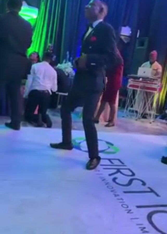 Here is a detailed description of the video: The video shows a man in a dark suit with a bowtie dancing on a brightly lit dance floor, with a large graphic design spelling out "FIRSTO" and the words "INSIGHT | INNOVATION | IMPLEMENTATION." He appears to be leading the dance with distinct hand movements. In the background, other people are milling around. A DJ set up is visible with someone operating it. There is a backdrop of blue drapes, and the event appears to be a formal gathering. Some people are seated and others are standing. The lighting shifts between blue and green.