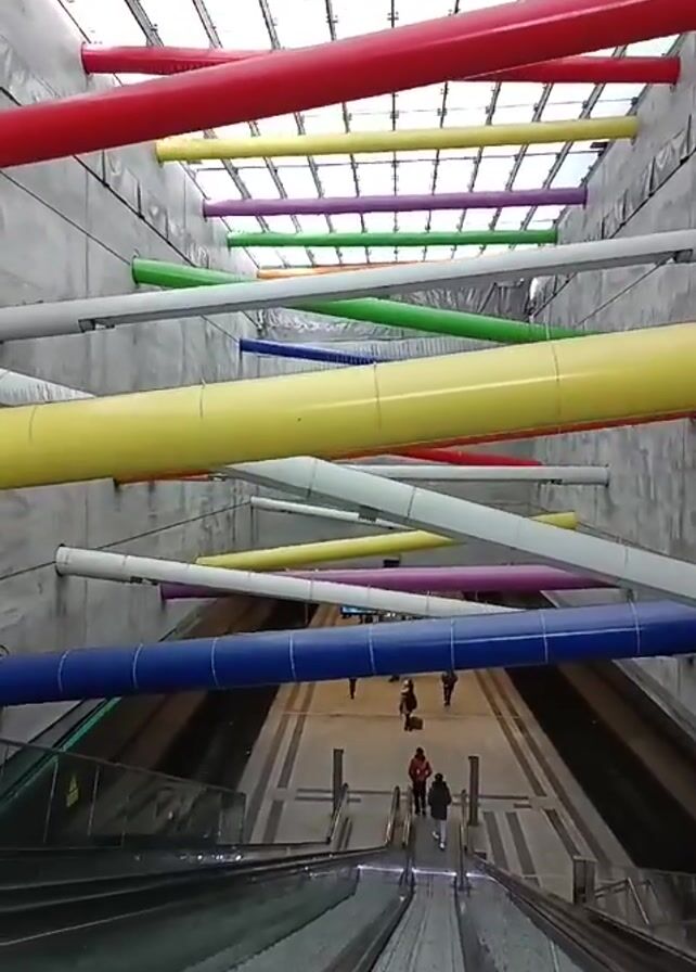 interior of a subway station. The camera is positioned at the top of an escalator, looking down towards the platform. Several people are visible walking on the platform. The station has an unusual architectural design with a ceiling adorned with many large, horizontally oriented pipes in various colors. The walls of the station are gray and appear to be made of concrete. The lighting in the station is bright.