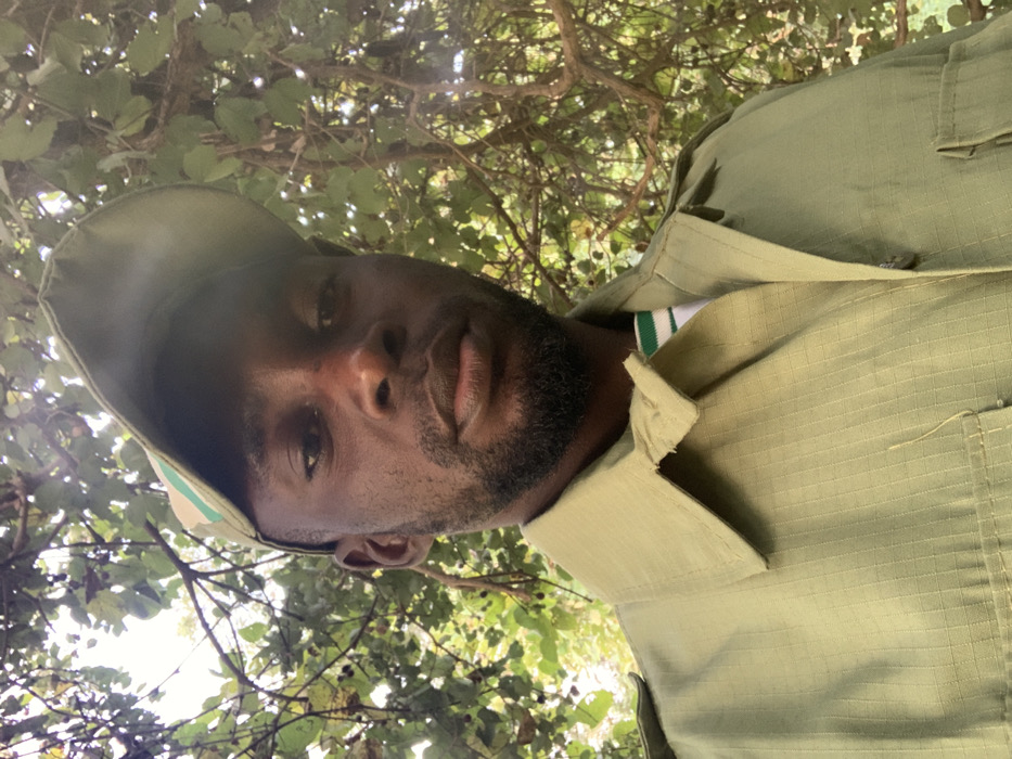 A male individual is depicted in a close-up, outdoor portrait taken in Kubi A, Nigeria. He has dark skin, short dark hair, and a neatly trimmed beard, gazing directly forward with a neutral expression. He wears an olive-green, collared, long-sleeved shirt or jacket, possibly uniform, made of a textured ripstop-style fabric, with visible shoulder epaulets and indications of chest pockets. Underneath, a white t-shirt with green horizontal stripes around the collar is visible. He also wears an olive-green baseball cap with a lighter green stripe on the brim, positioned slightly askew. The background consists of dense green foliage, including leaves and branches, suggesting a natural, wooded environment. Bright, diffused light filters through the canopy from above.
