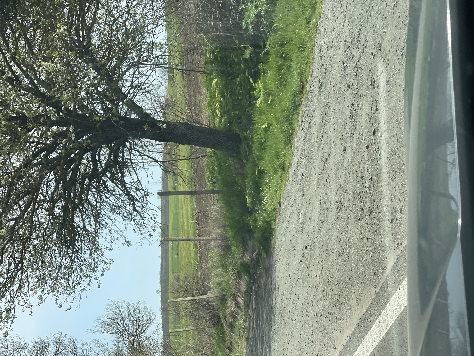 A rural roadside scene, likely photographed from inside a vehicle