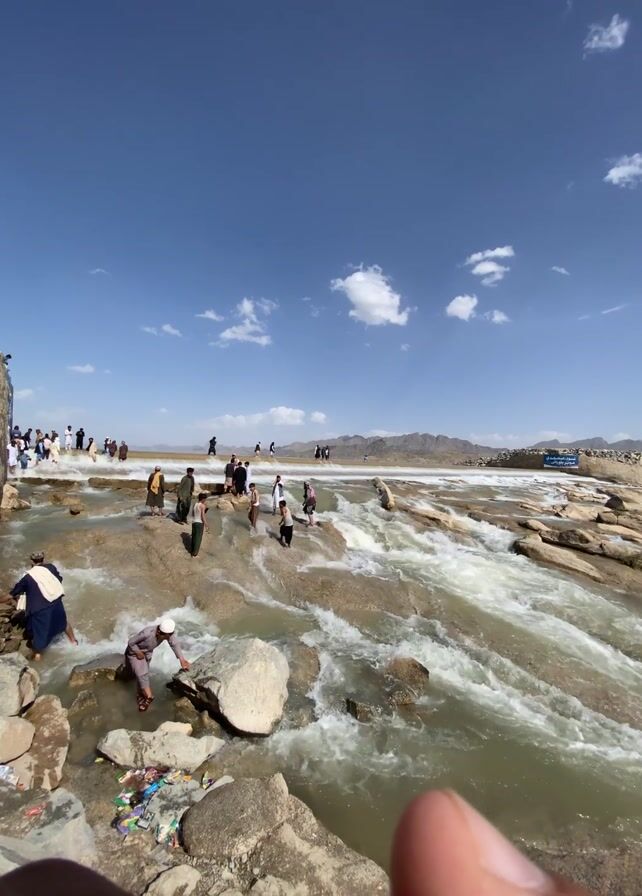 wide, rocky river with several small waterfalls under a clear blue sky dotted with fluffy white clouds. People, mostly men dressed in traditional Middle Eastern clothing, are walking and standing on the rocks in the river. The water is churning and foamy as it flows over the rocks, creating a dynamic scene. In the background, a low-lying mountain range is visible. The overall impression is a blend of natural beauty and human interaction.