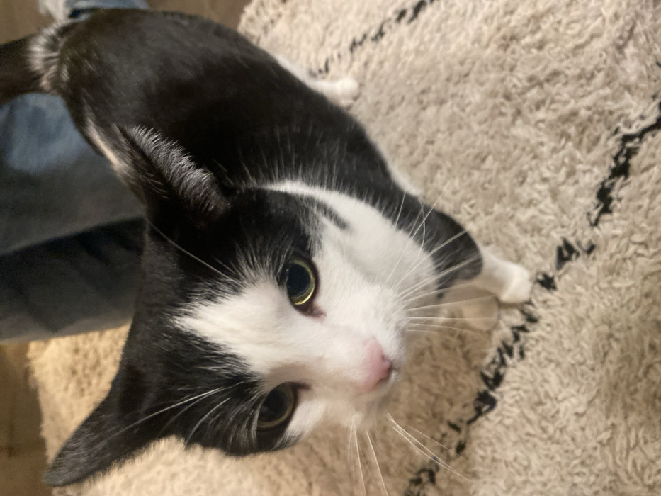 - "A black and white cat looks upwards, its face centered" by FM-niTNZ2, licensed under CC BY 4.0
