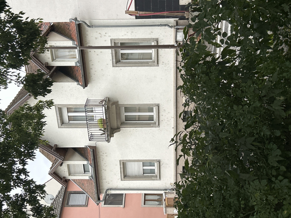 The image depicts the facade of a residential building in Strasbourg, France, partially obscured by dark green foliage in the foreground and overhead tree branches. The primary building is a multi-story structure with a light-colored, possibly off-white or cream-colored, stucco exterior exhibiting scattered dark marks. It features a pitched roof with reddish-brown tiles and multiple dormer windows. On the first floor, a central balcony with a black wrought-iron railing extends from the facade, supported by a decorative stone console. A white-framed door provides access to this balcony, which holds a single terracotta pot containing a green plant. Two dark-feathered birds, likely pigeons, are perched on the left section of the balcony railing. To the left of the balcony, a rectangular window is fitted with a closed external roller shutter (volet roulant). To the right of the balcony, another rectangular window with a white frame is visible, showing interior light-colored coverings. On the ground floor, partially visible through the foliage, a rectangular window on the left has a partially closed external roller shutter. Another rectangular window with a white frame is visible to its right. Two dormer windows are present on the attic level; the left dormer has a partially closed external roller shutter, and the right dormer has a white-framed window. A dark rainwater downpipe runs vertically on the far right side of the building. A prominent vertical pole stands in front of the building, slightly right of center. To the left of the main white building, a section of an adjacent building with a pale pink or salmon-colored stucco facade is visible. This building also has a pitched roof with reddish-brown tiles and a dormer window with a closed roller shutter. A satellite dish is mounted on its roof. Below the dormer, a window with a partially open roller shutter is visible, and another window is seen further down. The lower third of the image is dominated by dense, dark green foliage, obscuring the ground level and the lower sections of the buildings. Overcast skies are indicated by the diffused lighting. No human subjects are present.