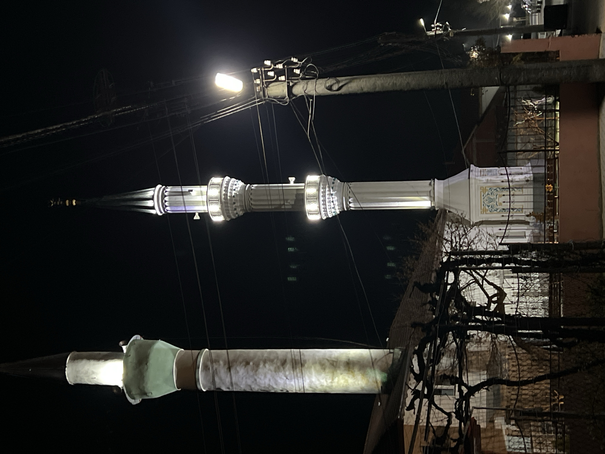 The scene depicts a nighttime urban environment in Kornitsa, Bulgaria. Two minarets are prominent against a dark sky. The minaret on the left is tall, slender, and light-toned, featuring a pointed dark spire and a prominent light green-banded section, illuminated from below. The minaret on the right is shorter, white, and more ornate, characterized by two visible balconies (sherefes) with decorative balustrades, an intricately patterned base, and a pointed spire topped with a finial; it is brightly illuminated with warm white light. Overhead utility lines crisscross the frame, passing in front of and behind both minarets. To the far right, a brightly lit street lamp with a rectangular luminaire is mounted on a concrete utility pole equipped with multiple insulators. Portions of residential buildings with dark roofs and some faintly glowing windows are visible in the background and lower left. A low, terracotta-colored wall and a black metal fence with decorative elements are present in the lower foreground, bordering the base of the right minaret. Bare, gnarled tree branches or trellised vines are visible in the immediate lower-left foreground. No human figures or active interactions are discernible within the frame.