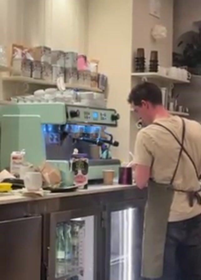 A cafe employee in a tan shirt and green apron is mixing drinks at a counter behind which is a light-green espresso machine