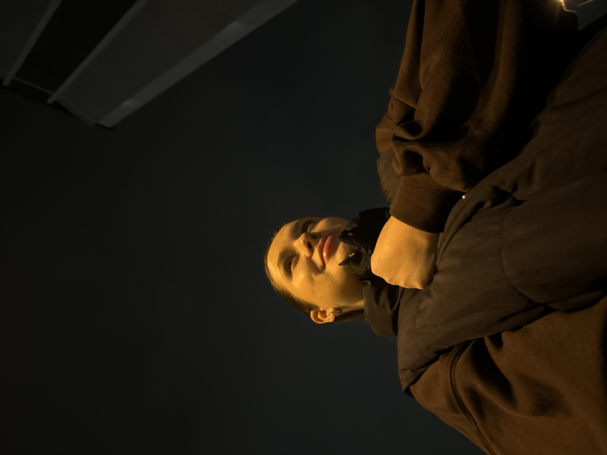 A low-angle, night-time photo depicts a person looking up. The subject is a fair-skinned individual wearing a dark jacket over a brown hooded sweatshirt. The background is dark, suggestive of night, with artificial lighting visible in the upper left corner. The location is potentially Akulovo, Gp Kubinka, Russia, based on the user's prompt.