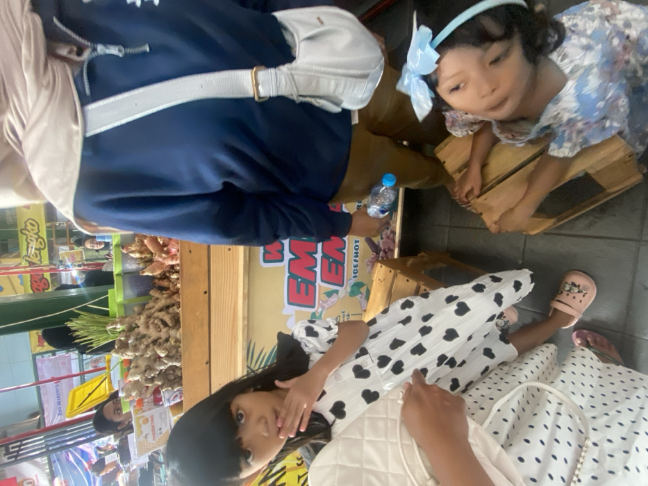 A market scene features two young girls. One wears a blue dress with a light blue headband, seated on a small wooden pallet. The other wears a white dress with black hearts, standing next to a woman in a white quilted jacket. In the background, a vendor stall displays ginger and lemongrass. A person wearing a blue jacket holds a water bottle near a wooden stall with the words "EM Em." on it.