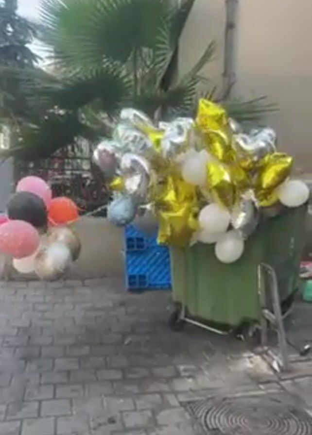 variety of balloons attached to a green garbage bin on a paved street. A cluster of pastel-colored balloons is on the left, while the balloons on the bin are silver and gold star-shaped mylar balloons, some white balloons. In the background there is a palm tree and the side of a building. The street is littered with trash.
