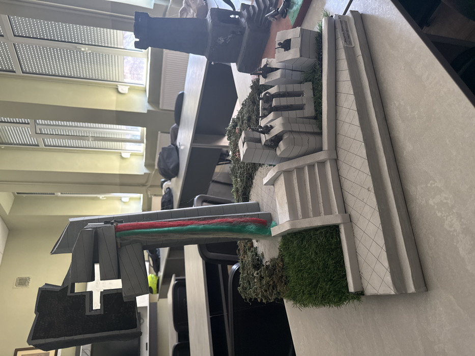 A detailed scale model of a commemorative monument, identified as relating to Nova Zagora, Bulgaria, is positioned on a light-colored table