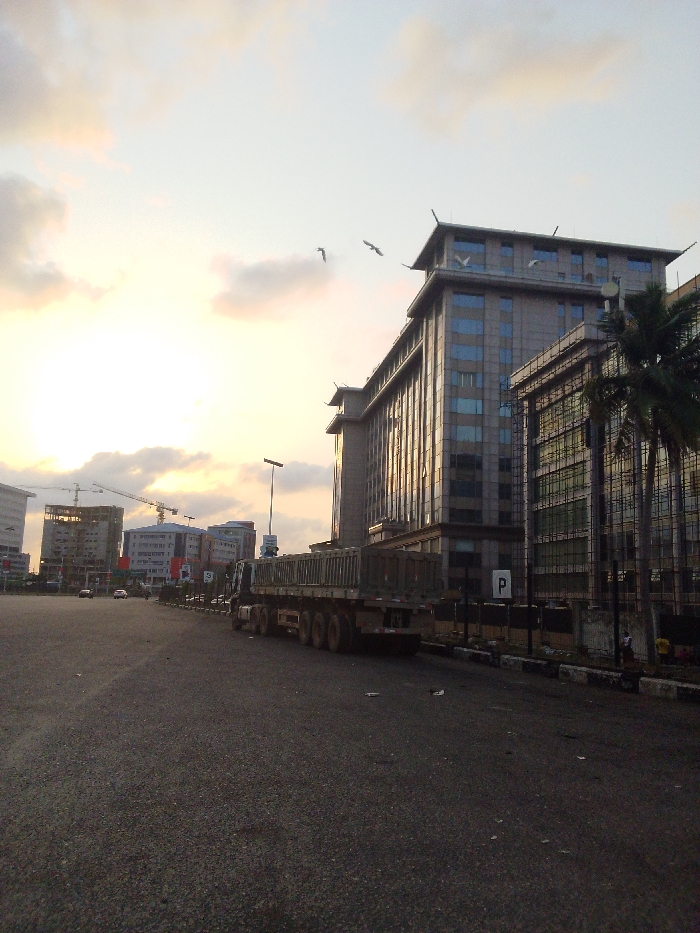 An empty, dark gray asphalt road stretches toward buildings under a muted sunset sky. Cranes indicate construction activity. A large flatbed truck occupies the roadside, facing right, with its shadow cast on the road. Buildings include both completed structures and those under construction, with palm trees lining one. Birds fly in the sky. A parking sign is visible near one of the buildings.