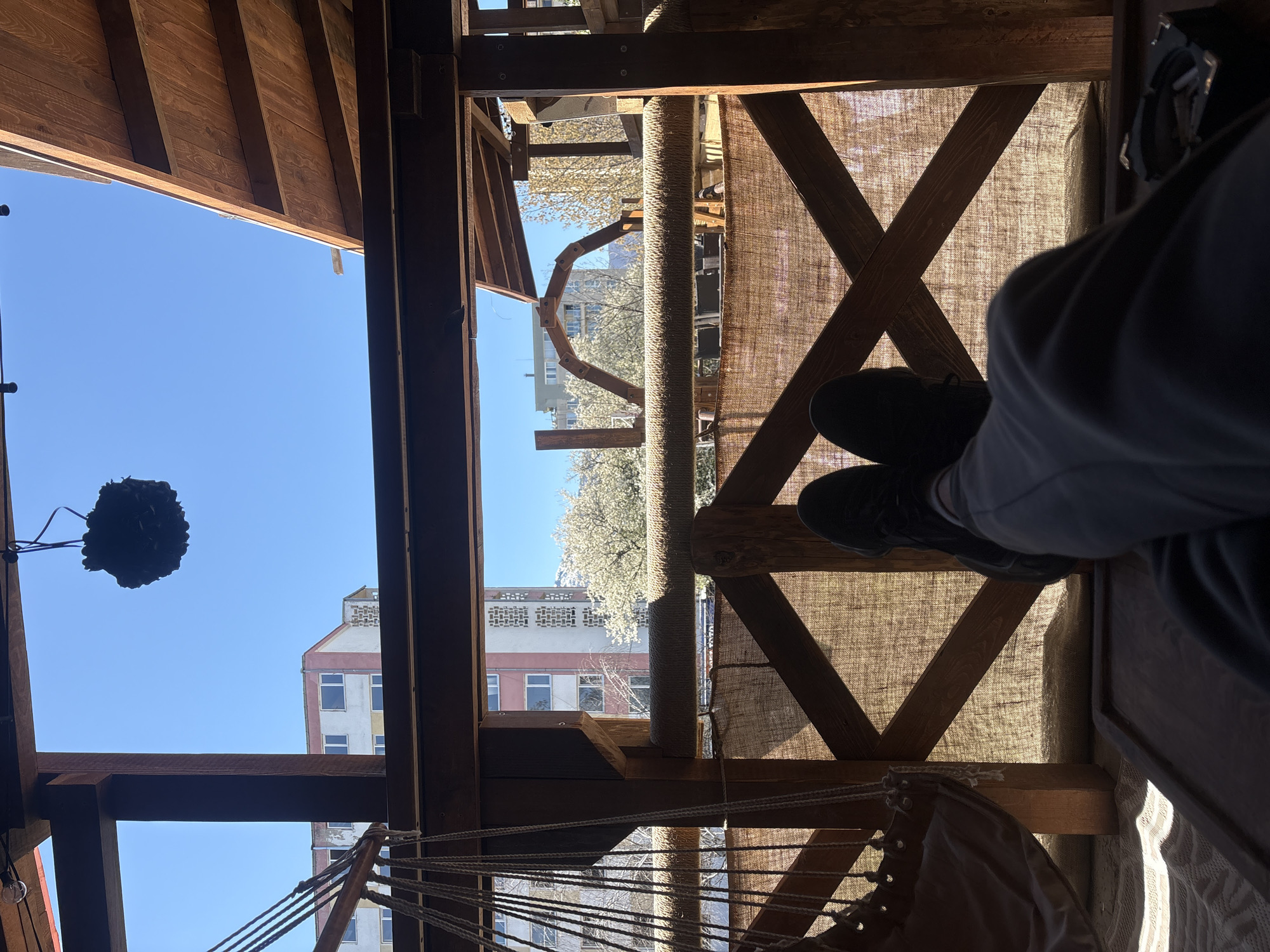 The scene, likely in Sofia, Bulgaria, is shot from a low angle, looking up through a wooden structure, possibly a porch or gazebo. The blue sky is visible, along with sections of buildings and flowering trees. Part of a person, including shoes and legs, is in the foreground on the right, suggesting they are relaxing inside the structure. The structure is made of wood with woven or burlap-like panels. A hammock is also visible. There is an outdoor lamp hanging.