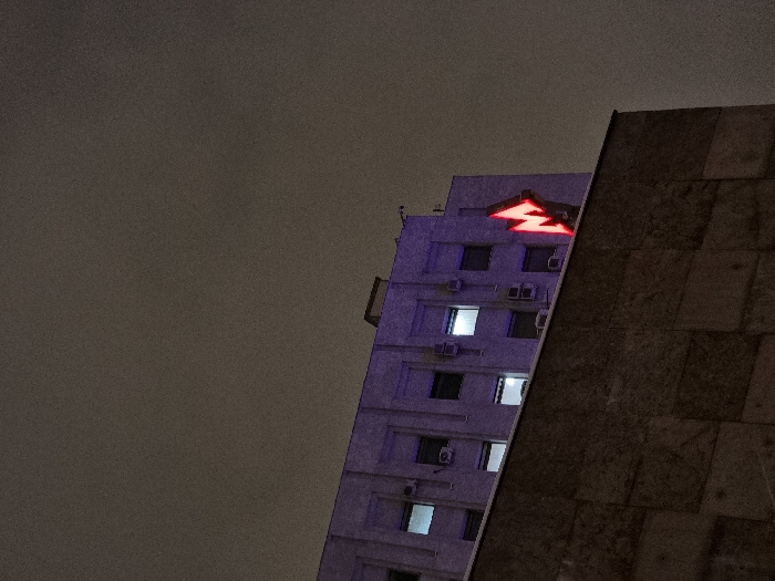 - "A tall, pale building with a red, stylized emblem on top stands against a dark sky" by FM-u6qup2, licensed under CC BY 4.0