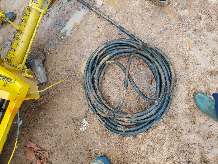 A coiled, dirty black cable rests on mud-covered ground. The coil is loosely bound with some material. To the left, a bright yellow piece of machinery is partially visible. A stone sits near the machine, also coated in mud. In the lower portion of the frame, there is a glimpse of red fabric on the ground. Parts of a turquoise-colored object can be seen at the right.