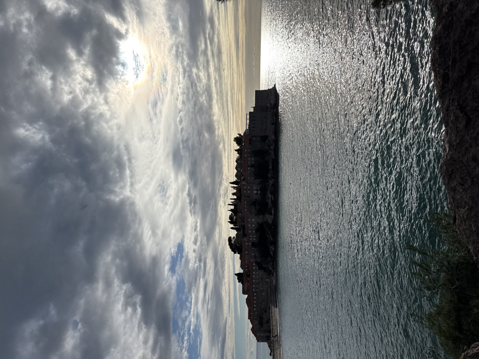A coastal view showcases an island, possibly a town, extending into the sea