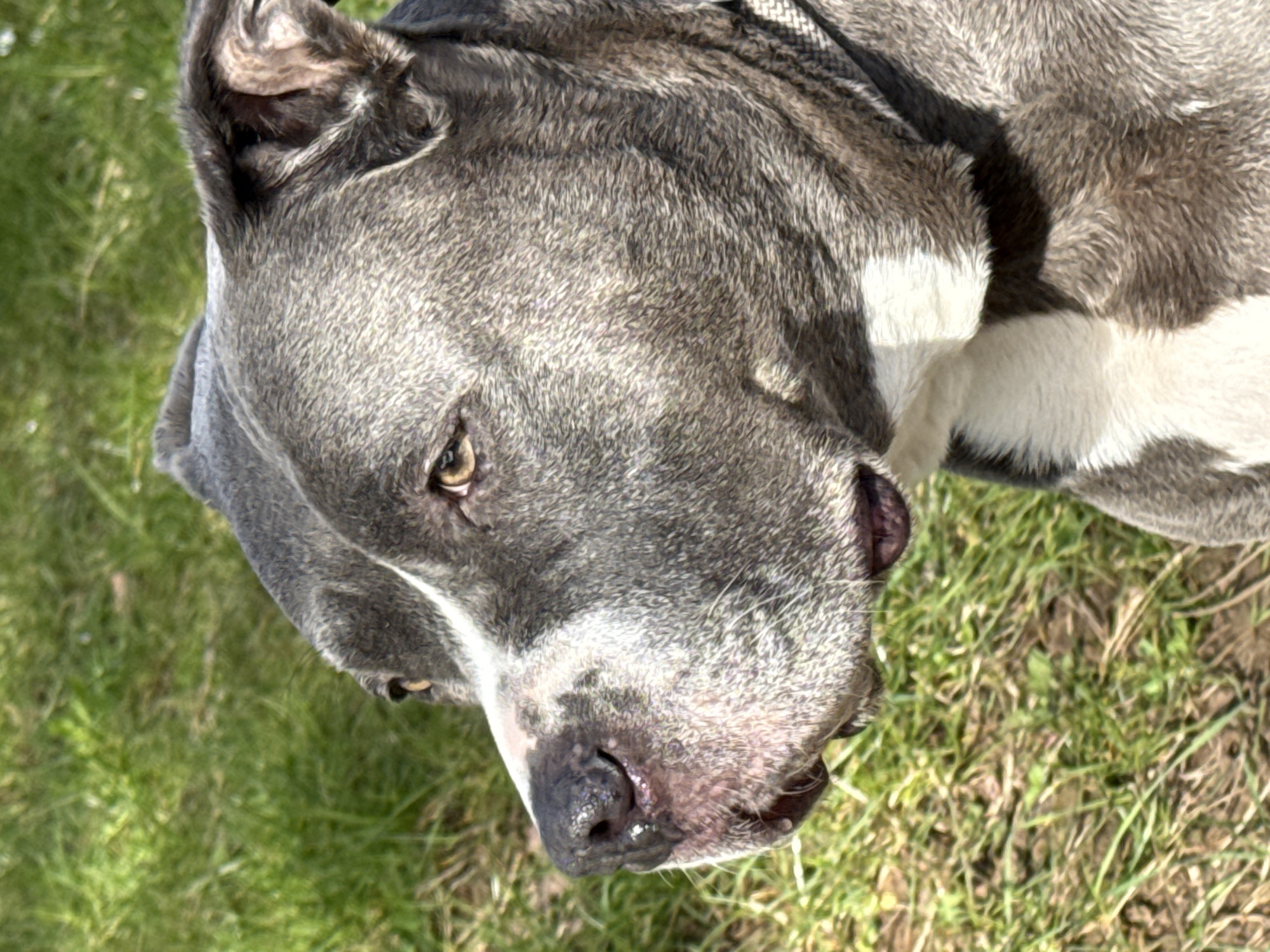 A close-up shot focuses on the head of a gray and white dog lying on green grass