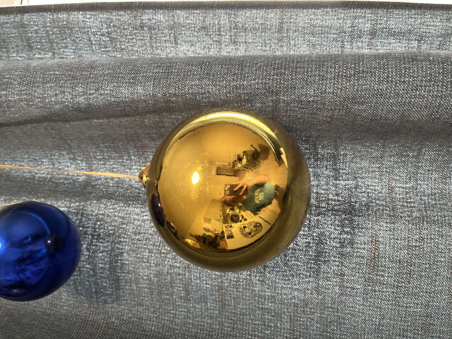 - "The image displays two spherical Christmas ornaments suspended against a textured, gray-blue curtain, likely in a domestic indoor setting located in Anapa, Russia" by FM-FgmyG3, licensed under CC BY 4.0