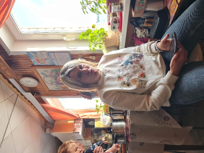 A woman with blonde-streaked hair poses for a photo while seated. She wears a white sweatshirt with floral designs and blue jeans, holding a phone in her hands. The background shows a kitchen interior, featuring a window, wooden cabinets, a dining table with a patterned tablecloth, and various kitchen items. Another person is visible in the lower left corner, partially out of focus.