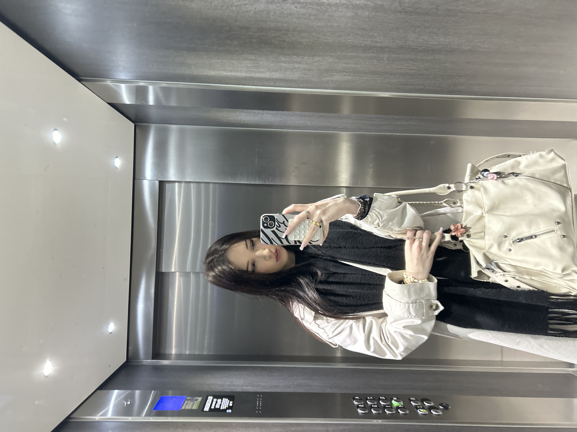 The photograph depicts a woman taking a selfie inside an elevator. She is holding a phone with a zebra-striped case in her right hand, her fingers adorned with rings and manicured nails. She has long, dark hair and is wearing a black scarf, a light-colored jacket, and a pearl bracelet on her left wrist. A cream-colored handbag hangs from her shoulder. The elevator interior is stainless steel with a control panel featuring buttons and a display screen with blue text. One wall is off-white with embedded lights. The location is Cachan, France.
