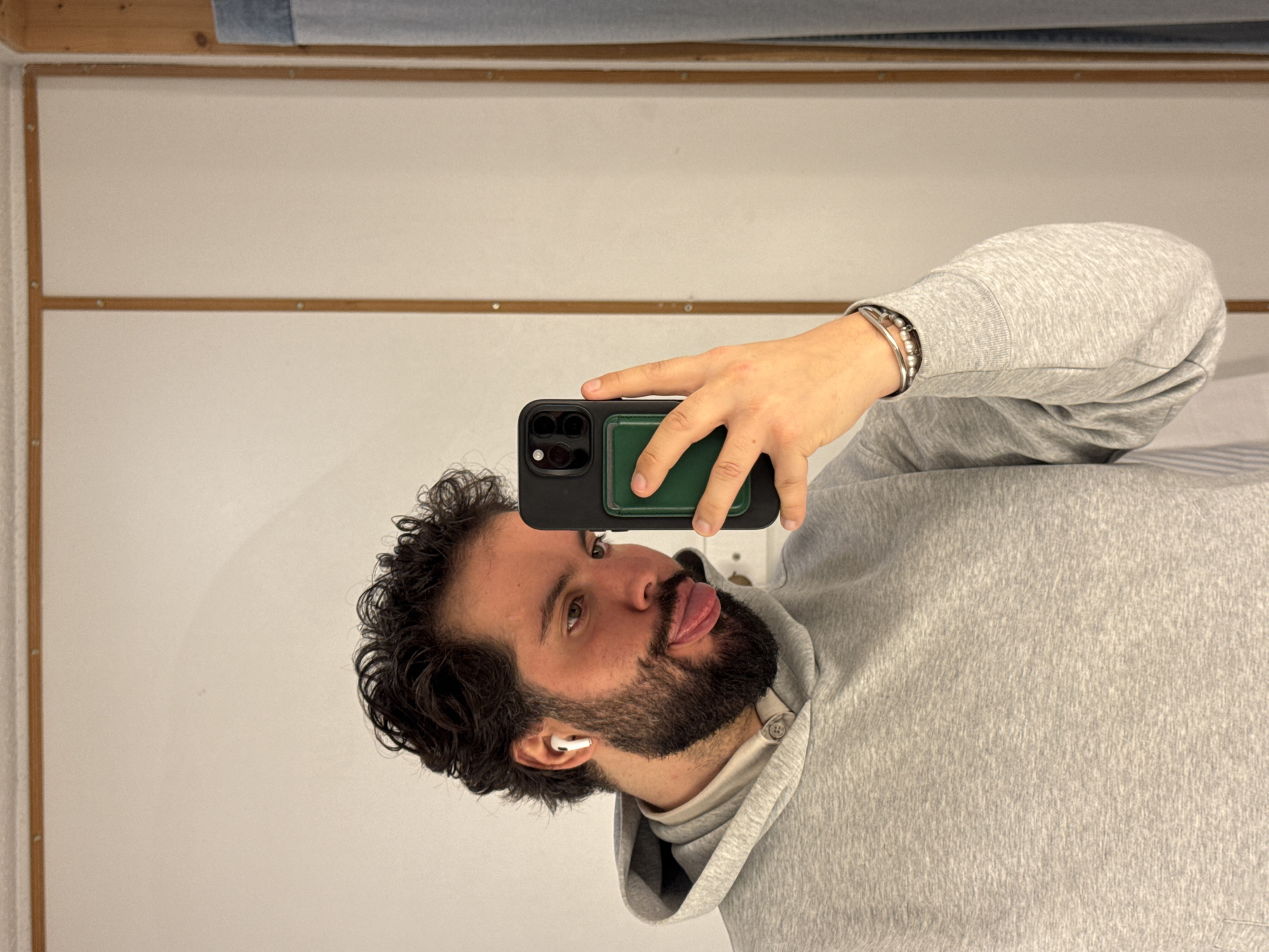 The image displays a male individual, appearing to be an adult, taking a mirror selfie indoors. He possesses dark, curly hair, a full beard, and a mustache. A white wireless earbud is visible in his left ear. He is wearing a light grey hooded sweatshirt over a light-colored collared shirt. On his right wrist, he wears several bracelets, including silver-toned bands and a string of white beads. With his left hand, he holds a smartphone featuring a dark case and a green accessory attached to its back, partially obscuring the lower right side of his face. The individual is looking towards his right and has his tongue slightly extended. The background consists of a plain, light-colored wall. Visible elements include a horizontal wooden strip at the top and a vertical wooden frame on the right side of the wall. A fragment of light blue fabric is discernible on the far right edge of the frame. The specific location within the city of Gondomar, Portugal, is not identifiable from the provided image.