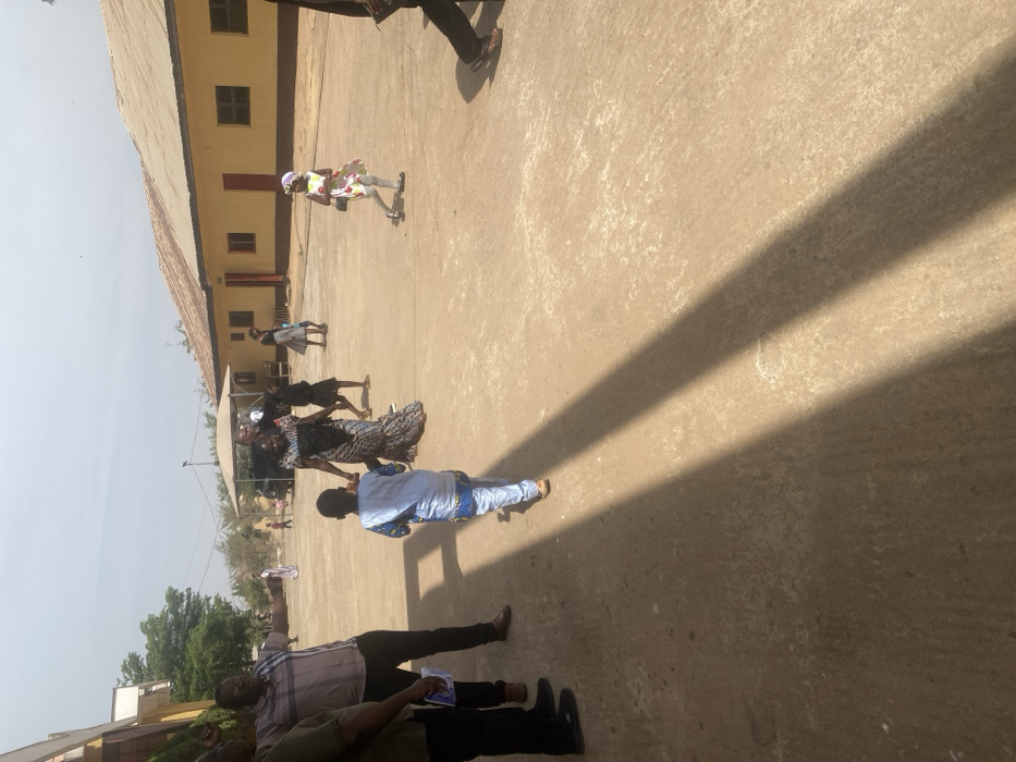 The image depicts an outdoor gathering or transit scene in Narayi, Nigeria, under a bright, clear sky. The ground is an unpaved or light-colored concrete surface, showing long shadows cast by people, indicating strong sunlight. To the left, a building partially covered by green foliage is visible. In the background right, a prominent single-story yellow building with multiple windows, a red door, and a rusted corrugated metal roof is present. In the foreground left, two adult males are standing; one in a dark green shirt is partially obscured, while the other, wearing a striped shirt and dark pants, has his arms outstretched and holds a white booklet in his left hand. Directly in front of the camera, a young boy in light blue traditional Nigerian attire walks away from the viewer towards the center of the frame. In the mid-ground, a woman in a dark, patterned floor-length dress walks towards the right, seemingly accompanying a child. Further right, a young girl in a white, patterned dress, white tights, and a floral headpiece walks right, carrying a small purse. Various other individuals, including adults and children, are scattered across the open area, moving in different directions, some near a dark canopy structure in the mid-background. The legs and lower torso of a person in dark clothing are visible on the far right foreground, moving out of frame.