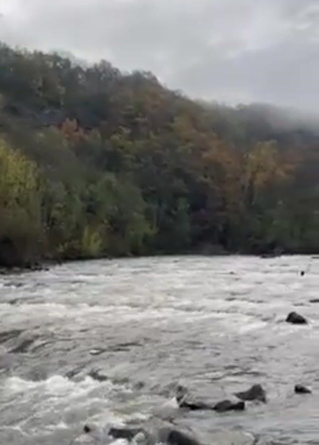 wide river with rapids, flowing between rocky banks. The water is grey and turbulent, with visible white foam. A forested hill rises in the background, with some trees showing fall colors and others still green. Mist obscures the higher parts of the hill. The sky is overcast.