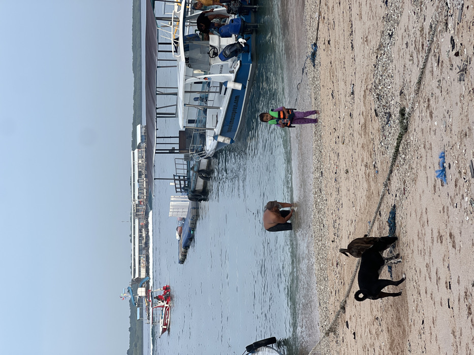 A vertical beach scene shows a boat docked in the water, a child wearing a life jacket standing near the shoreline, and an adult sitting and playing in the water. Two dogs are together on the sand. A rope lies on the beach. In the distance, buildings line the horizon.