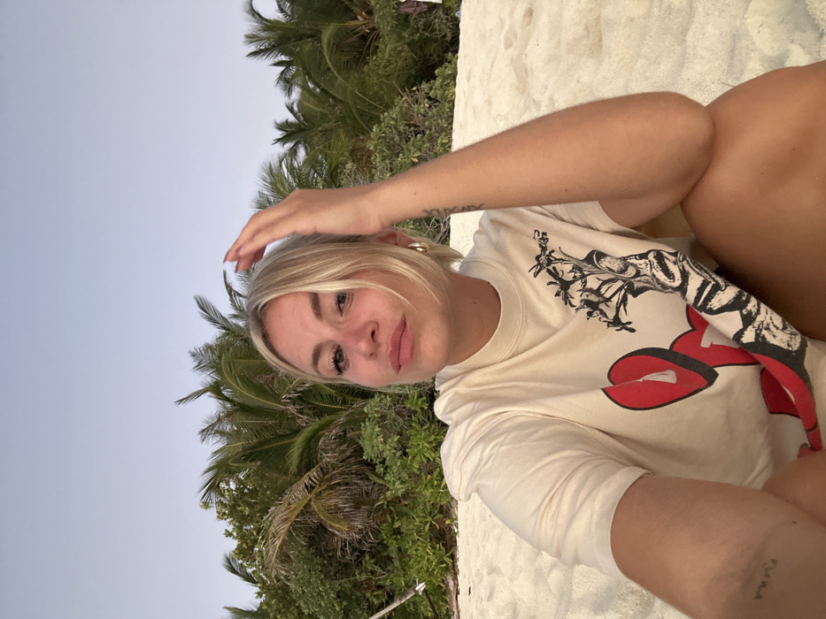 A blonde female is depicted seated on a white sandy beach in Thoddoo, Maldives. She looks directly into the camera with a slight pout, her right hand touching the hair above her right ear. She wears a light-colored, short-sleeved t-shirt featuring a large red abstract shape and a monochrome graphic resembling a gnarled tree or plant with a human-like form. Small gold hoop earrings are visible on her ears, and a script tattoo is present on her left forearm. Behind her, dense tropical vegetation, primarily palm trees, rises from the sand. The sky above is a pale blue-grey, indicating either dawn or dusk.