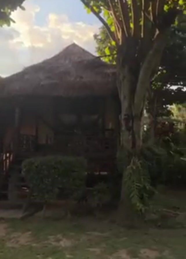 collection of traditional thatched-roof huts, likely bungalows, in a tropical resort setting. The huts are elevated and feature wooden steps leading up to small verandas. The surrounding landscape consists of a well-maintained lawn, lush greenery, and tall trees. The video pans slowly across the scene, showcasing the overall ambiance of the resort. The sky is partly cloudy with patches of blue visible between the trees. The video creates a sense of serenity and relaxation.