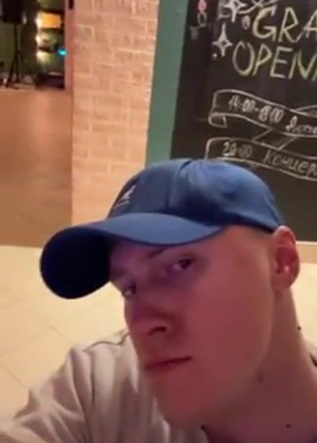 A close-up shot shows a young man wearing a blue baseball cap and a light-colored t-shirt. He looks directly at the camera with a neutral expression, then removes the cap slightly, revealing a closely-shaved head. He then adjusts the cap back on his head. In the background, a chalkboard displays the words "GRAND OPENING" and some additional writing in a language other than English. The setting appears to be inside a building, possibly a restaurant or bar. The lighting is somewhat dim, with a warm glow. A brick wall can be seen in the background.