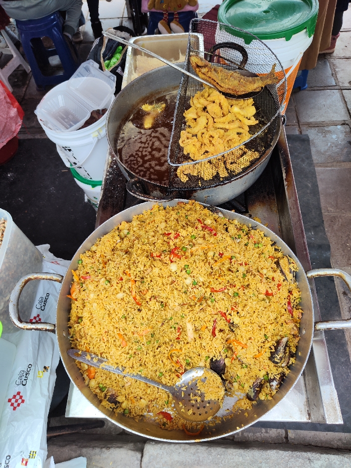 The image depicts an outdoor food stall scene in Wanchaq, Peru, centered on prepared food items. In the foreground, a large, wide metal pan contains a substantial quantity of yellow rice, uniformly mixed with chopped red peppers, green peas, carrots, chickpeas, and mussels. A perforated metal serving spoon rests within the rice. Elevated directly behind this pan is a smaller, deep metal pot holding simmering dark cooking oil. A half-moon shaped metal frying basket is positioned above this pot, containing a single golden-brown fried fish and a quantity of irregular, breaded fried pieces, consistent with calamari. In the upper left background, multiple white plastic buckets are visible; one contains stacked clear plastic takeout containers. The lower legs of at least two individuals, seated on blue plastic stools, are partially discernible in the upper left. A white plastic bag with a 'Caja Cusco' logo is visible in the lower left. The ground surface consists of light-colored paving stones.