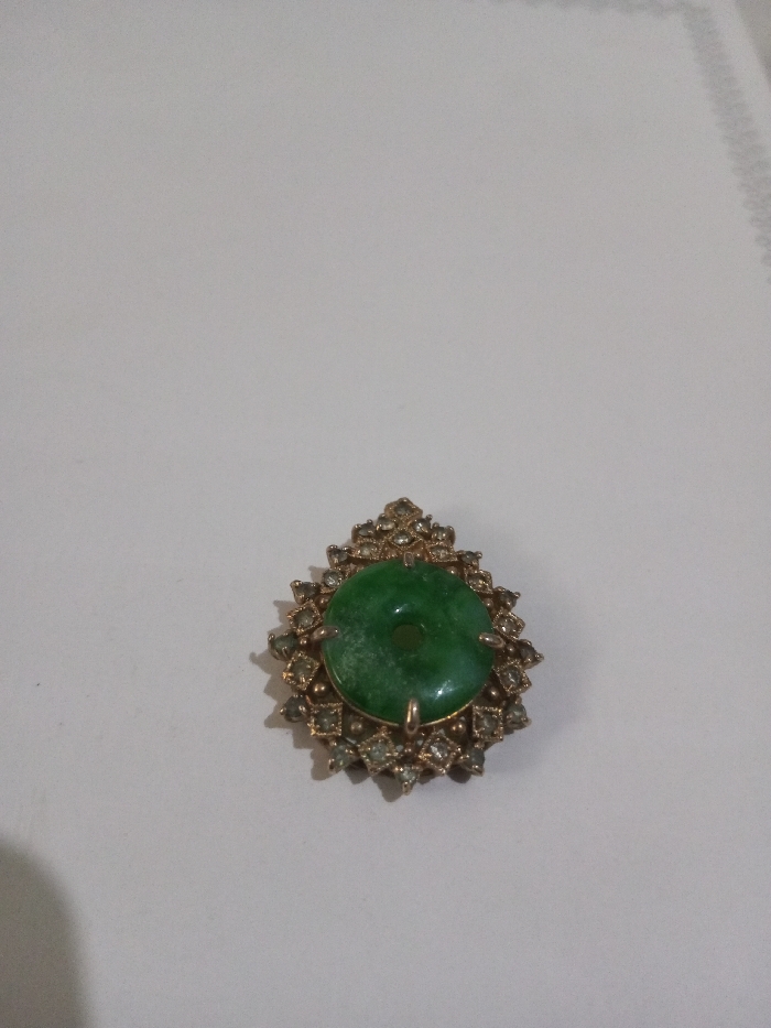 This image depicts a single piece of ornate jewelry placed on a plain, light grey surface. The location is Ciherang, Indonesia. The jewelry item, approximately 3 cm in height, features a central, circular, flat green stone, consistent with jade, which has a small circular perforation in its center. This green stone is encased in a gold-toned metal setting that is surrounded by multiple smaller, clear, faceted stones, likely cubic zirconia or diamonds, arranged in a radiating, pointed oval or starburst pattern. The entire piece exhibits an intricate, shield-like design. The object casts a soft shadow on the uniform light grey background. A faint, repeating geometric pattern is visible along the right edge of the background surface, possibly from textured paper or fabric. No individuals or actions are present in the scene.